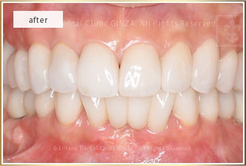 - 心配していた歯周病は完治 グラグラした歯や血がでる様な歯は一本も無くなった。全顎的にセラミックの歯になり、審美性・機能性が大きく改善とても綺麗な笑顔になりました。