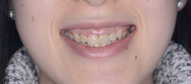 年齢 28歳 性別 女性 主訴 前歯の差し歯の付け根が黒ずんでいるのと歯茎に段差があるのを改善したい 治療 右前歯の差し歯部の歯茎の腫れや歯茎のガタつきは審美性を損なうため、患者様と相談しこのケースではクラウンレングスニングを行わずにエクストルージョンテクニックを使うことにした。エクストルージョンとは簡単に言えば矯正を歯を伸ばす方向に行うことである。要は歯を引っ張り出してしまうわけである。これにより歯茎の位置も自由自在に変えることができる優れたテクニックである。欠点は矯正なので時間がかかることと僅かな後戻りがあり得ることである。